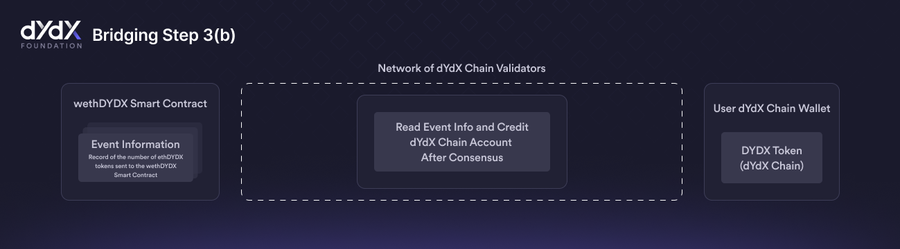 After an ethDYDX holder interacts with the wethDYDX Smart Contract, dYdX Chain validators can read and ingest the information from the contract. Once Step 1 is complete and ethDYDX is permanently locked in the wethDYDX Smart Contract, validators can distribute the corresponding amount of DYDX (1-1) to users on the dYdX Chain.&#x20;